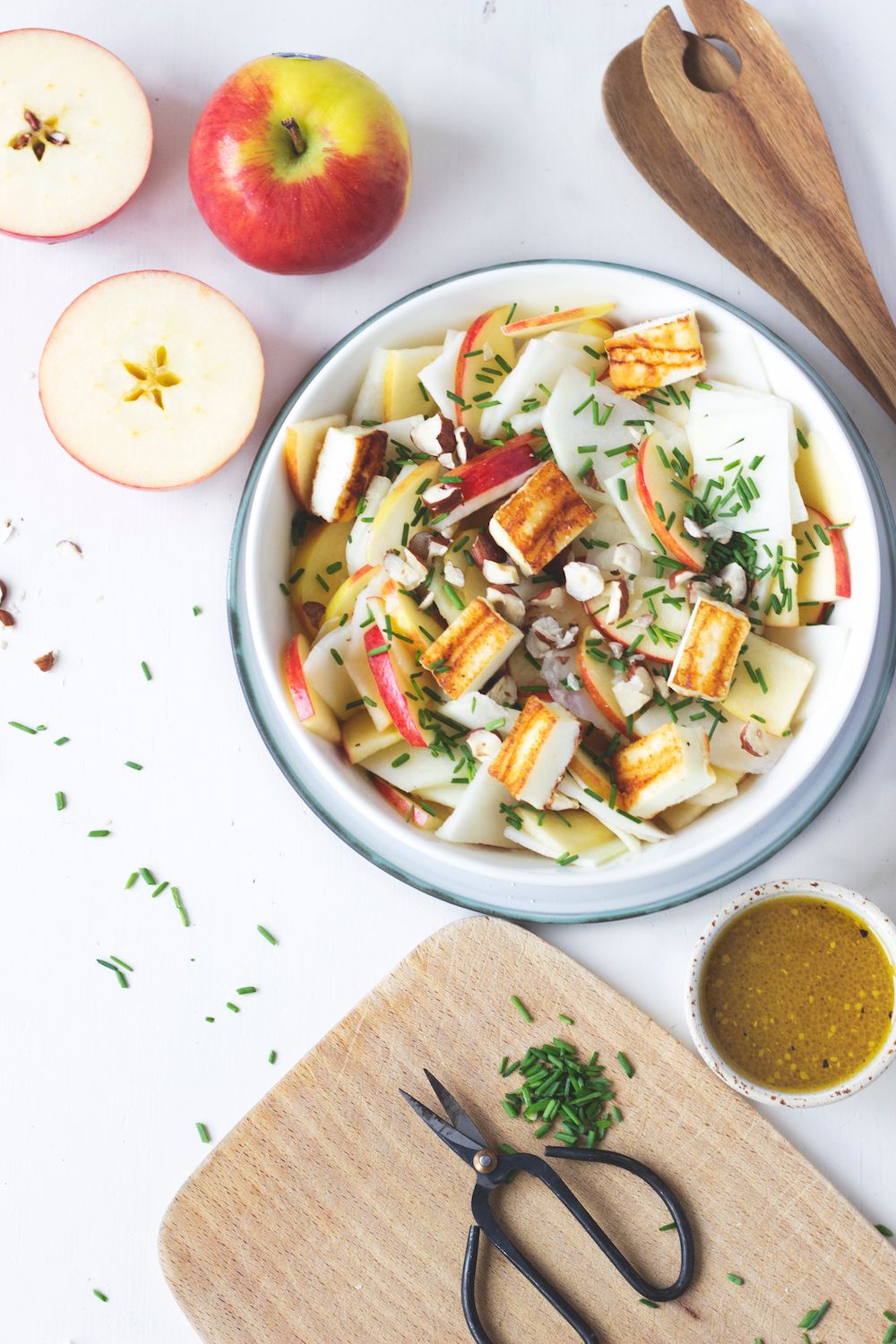 und regionales Gemüse, aber ganz ehrlich: Irgendwann habe ich von Kohl und Pastinaken nach dem Winter dann auch genug. Darum freue ich mich auf die ersten Gemüsesorten des Frühlings. Der Kohlrabi trifft hier auf die letzten Äpfel des vergangenen Jahres und auf Schnittlauch, Haselnüsse und Halloumi: