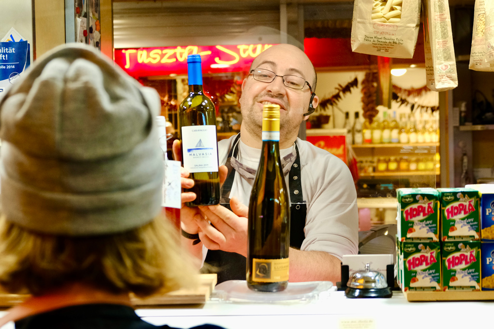 Während sie durch die Gänge schlendert und die Leckereien aus aller Welt begutachtet, erzählt Christine, dass sie gerade auch das persönliche Ambiente in der Markthalle schätzt: „Die Händler nehmen sich Zeit für ein kleines Schwätzchen und liefern auch gerne noch den einen oder anderen Tipp für die Zubereitung!“ So lässt sie sich bei der „Macelleria Italiana“ von Salvatore Mezzapella nicht nur die Salsiccia und frische Pasta einpacken, sondern gleich auch den passenden trockenen Weißwein dazu empfehlen.