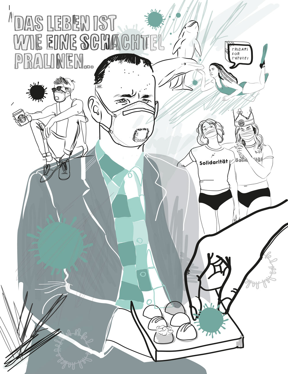 Froh bin ich auch, dass wenigstens bei den Stuttgarter Behörden alles beim Alten ist: Führerscheinstelle und Ausländerbehörde sind nicht zu erreichen, antworten nicht auf Emails und schon gar nicht sollte man es wagen, dort ohne Termin aufzukreuzen. Man munkelt, einige Stuttgarter Behörden seien schon seit Jahren in Quarantäne – vorsorglich. Froh bin ich auch, dass sämtliche Influencer aus Dubai, Mexiko und Peru durch die selbstlose Rückholaktion des Auswärtigen Amts wieder sicher vor ihren Ikea-Regalen sitzen und jetzt hoffen, dass das Virus nicht die Klickfarmen in Bangladesh erreicht. Grüße gehen raus an Ina Aogo. Ich bin auch froh, über ein Jahr ohne Frühlingsfest. Und froh, dass alle Tequila Bars mal geschlossen haben. Schrauben wir nach Corona unsere Ansprüche beim Feiern eigentlich runter, weil wir froh sind, wenn irgendwas offen hat? Oder hoch, weil wir wieder gelernt haben, Dinge mehr wertzuschätzen? Unterstützen wir lokale Anbieter, weil wir merken, dass unser Freundeskreis und unsere Bekanntschaften bei diesen Einzelhändlern und in diesen Bars, Restaurants und Clubs arbeiten? Wird Deutschland endlich digital? Fragen wir uns auch nach Corona noch, ob Löhne für Pfleger*innen erhöht werden sollten, wählen wir vielleicht sogar danach? Oder ist uns das dann wieder egal? Wie schnell kippt das Leben wieder, und alles ist ganz wie davor? Und die banalsten Dinge erinnern uns wieder an die kaputt zitierte „box of chocolates”, ohne dass es uns peinlich ist.