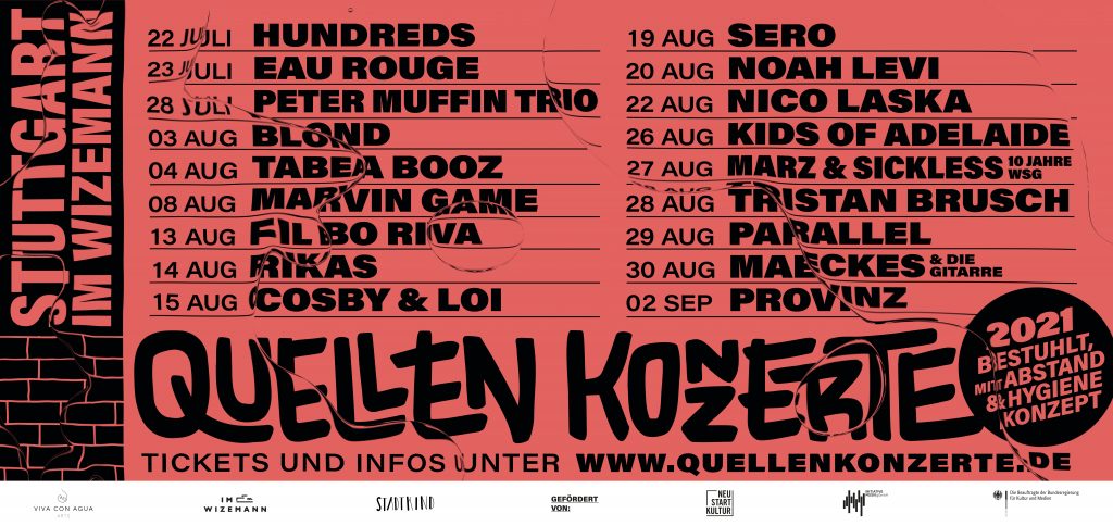 Anknüpfend an die „Quellen Galerie“ mit Viva con Agua ARTS aus dem letzten Jahr, startet das Im Wizemann im Sommer mit den „Quellen Konzerten“ eine neue Eventreihe. Bereits ab dem 22. Juli 2021 geht’s mit dem ersten Auftritt der Elektropop-Band Hundreds los, bis Anfang September stehen dann 17 weitere Konzerte von Acts wie Eau Rouge am 23. Juli, Sero am 19. August, 10 Jahre WSG mit Marz & Sickless am 27. August und als Finale am 2. September der Gig der Indiepop-Band Provinz auf dem Plan. Selbstverständlich wurde für die Termine ein umfassendes Hygienekonzept ausgearbeitet, das je nach aktuellen Regelungen dynamisch angepasst wird. Ein Euro pro Ticket wird außerdem an Projekte der Viva con Agua ARTS gespendet.