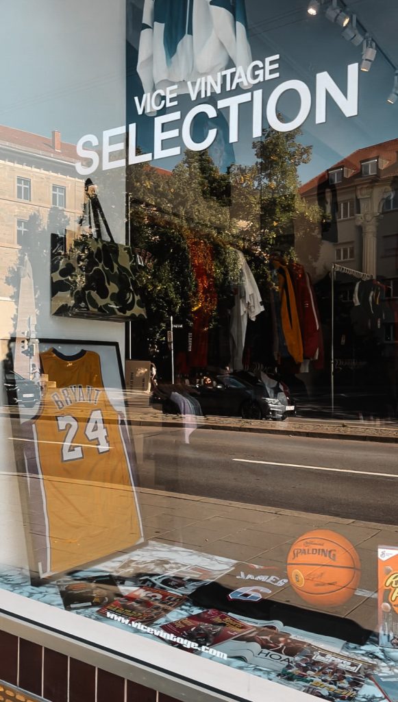 Uns macht besonders, dass wir die Leute auf eine Zeitreise mitnehmen können. Hier hat gerade eine ältere Dame zum Beispiel ein Tina-Turner-T-Shirt von 1987 mitgenommen. Wir versuchen irgendwie Kunst und Produkt zu verbinden, sodass man Nostalgie aufbauen kann. Vor allem ist es uns wichtig, dass die Leute, wenn sie hier rein steppen, den LA-Film und -Vibe ein bisschen mitnehmen und mitbekommen. Wir kaufen und verkaufen nicht nur Vintage-Kleidung, sondern wollen die Leute auch ein bisschen auf eine Reise mitnehmen – auch wenn’s nur kurz ist! Auch mit der Musik, dem Aufbau vom Laden. Damit wir den Leuten auch ein bisschen erzählen können, wen sie auf den Shirts hier sehen, von Michael Jordan oder Princess Diana. Jedes Piece hat eine Geschichte für sich und es ist cool, sie erzählen zu können.
